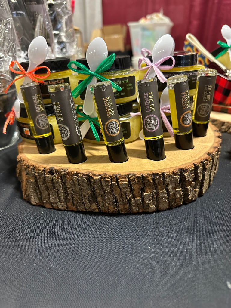 Ingredients: Cold Pressed Sunflower Oil and Natural Essential Oils (on scented sticks). Sunflower oil is very high in Vitamin E which helps nourish the skin. Can be used on the lips, under the eyes, cuticles, minor cuts, scrapes, burns, sun burn, and bug bites Can also be used as a men beard oil. Comes in non-scented, lavender, citrus, crème brulee (vanilla), creamsicle or peppermint.
